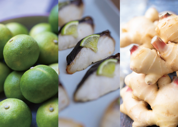 幽庵焼きと炊き込みご飯にふわりと香るすだちは、道の駅 海の京都宮津 まごころ市の生産者さん。新生姜は上宮津の若手農家さんおのの農園さん。