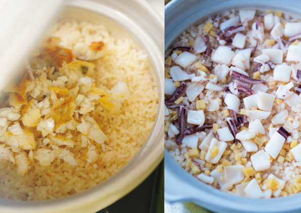 秋の初回10月は、柔らかくて甘い宮津湾のアオリイカと新生姜の炊き込みご飯、そして秋2回目(11月15日16日開催)は阿蘇海のスズキ飯が主役。アオリイカは柔らかく、新生姜との相性も抜群でほのかに香るすだちと共に。10月の回は、このアオリイカと塩握りに自家製ゆかりをぱらりと。きたる11月15.16日は阿蘇海のスズキを香ばしく焼いたアラをから出汁をとって鯛めしならぬスズキ飯に。